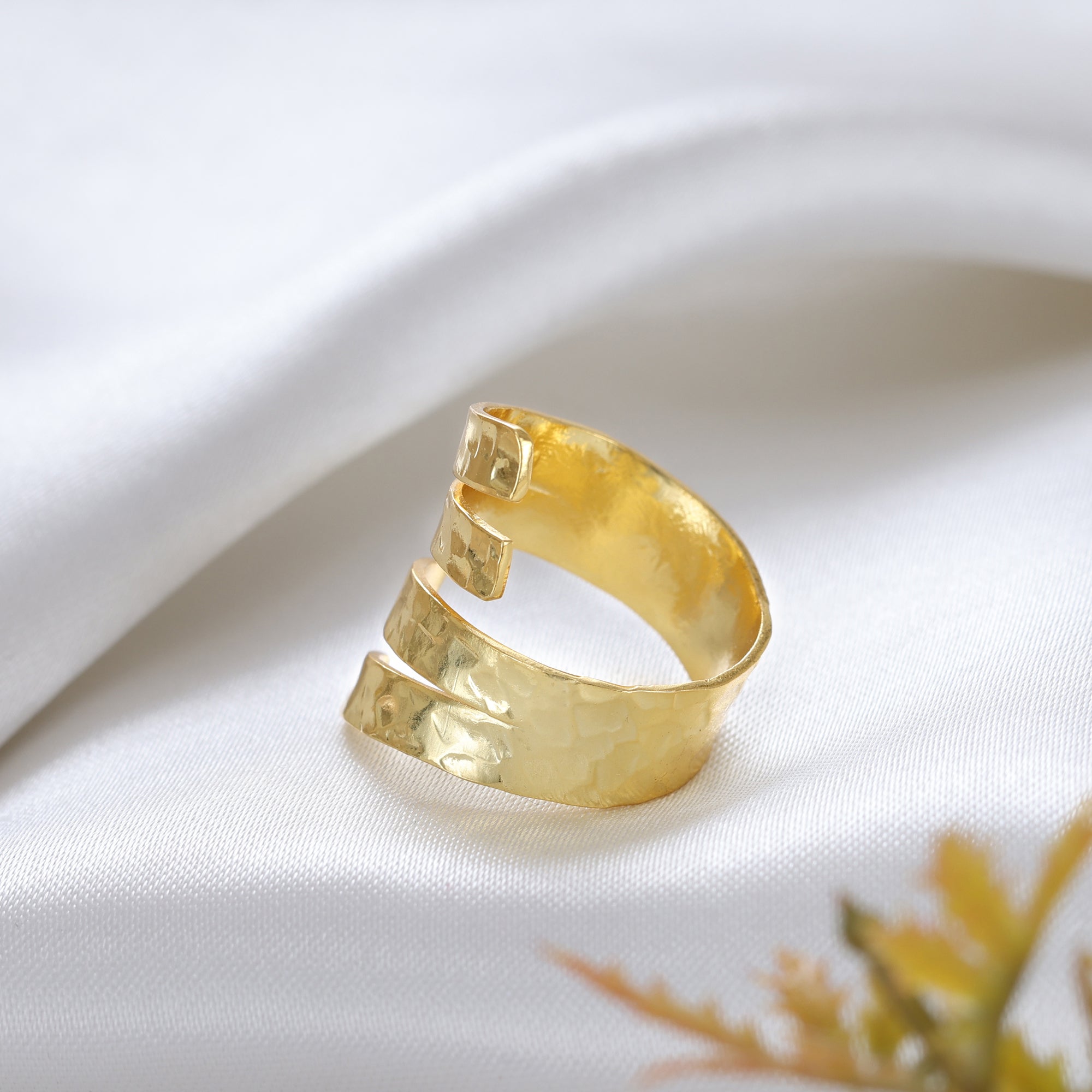 "ETHEREAL FOLDS WEAVE Gold RING" is a poetic representation of soft drapes folding gracefully over a women, embodying elegance and fluidity. It's design features gentle, flowing folds that evoke the essence of fabric in motion, with a subtle hand-textured weave adding depth and character. This intricate texture symbolizes the delicate interplay of threads, mirroring the beauty of handcrafted artistry.