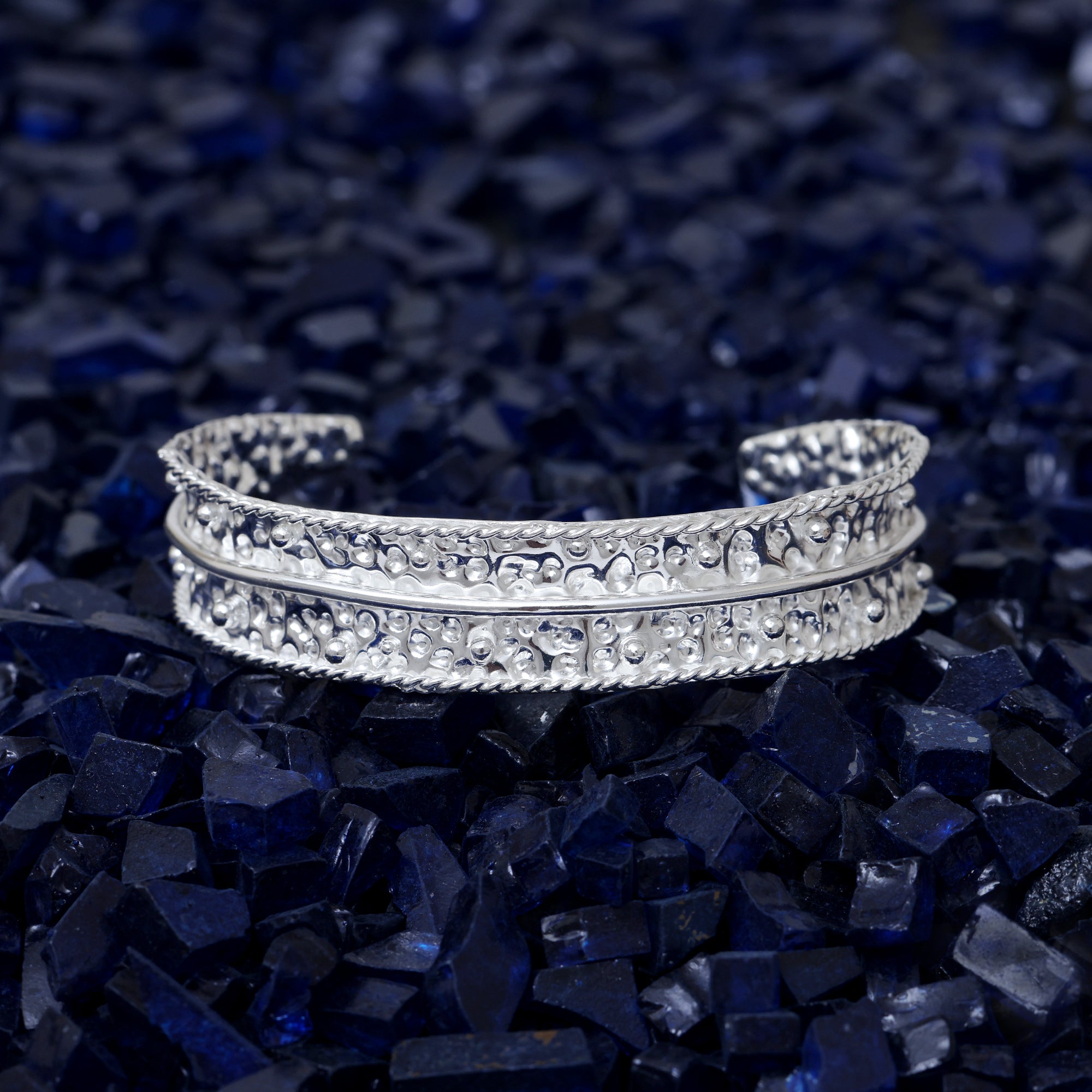 "FURROW DEW DROP SILVER CUFF BRACELET" is inspired by the delicate beauty of dew drops resting on tree branches. Furrow generally means different textures found on the barks of trees in a forest. The design captures the ethereal moment when morning mist settles on nature, with each dewdrop symbolizes purity and freshness.