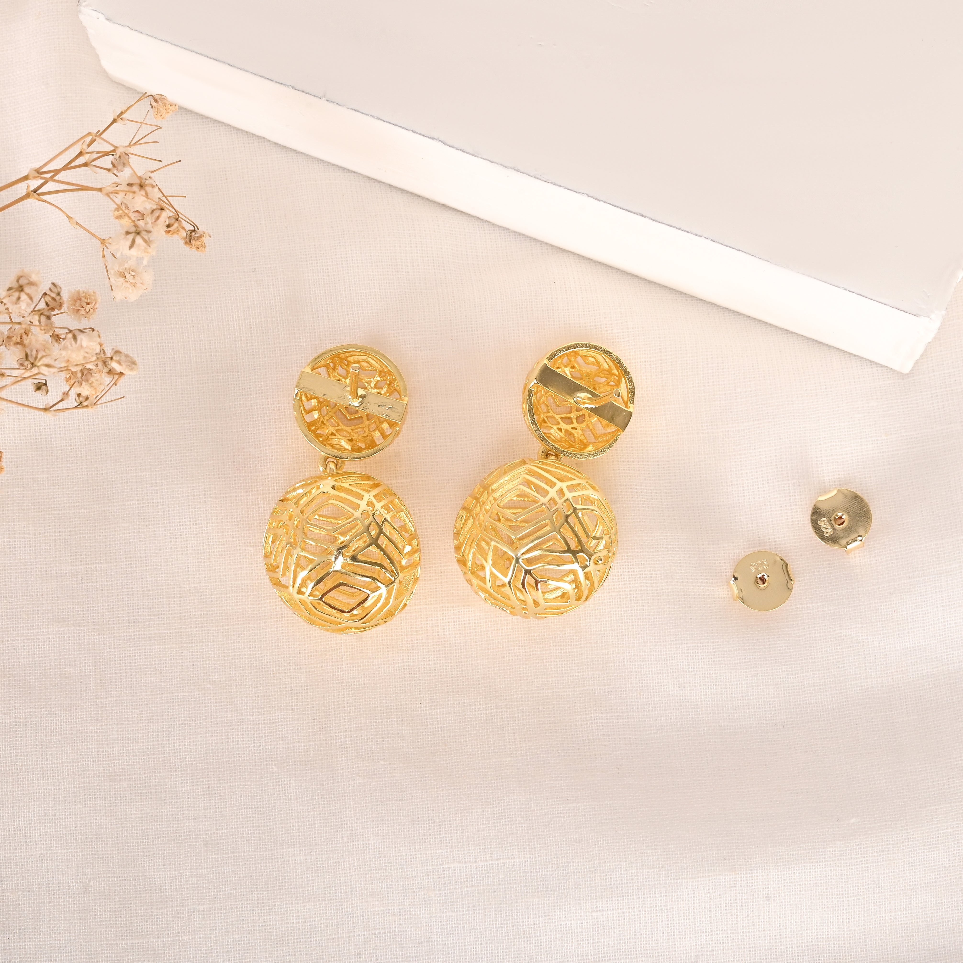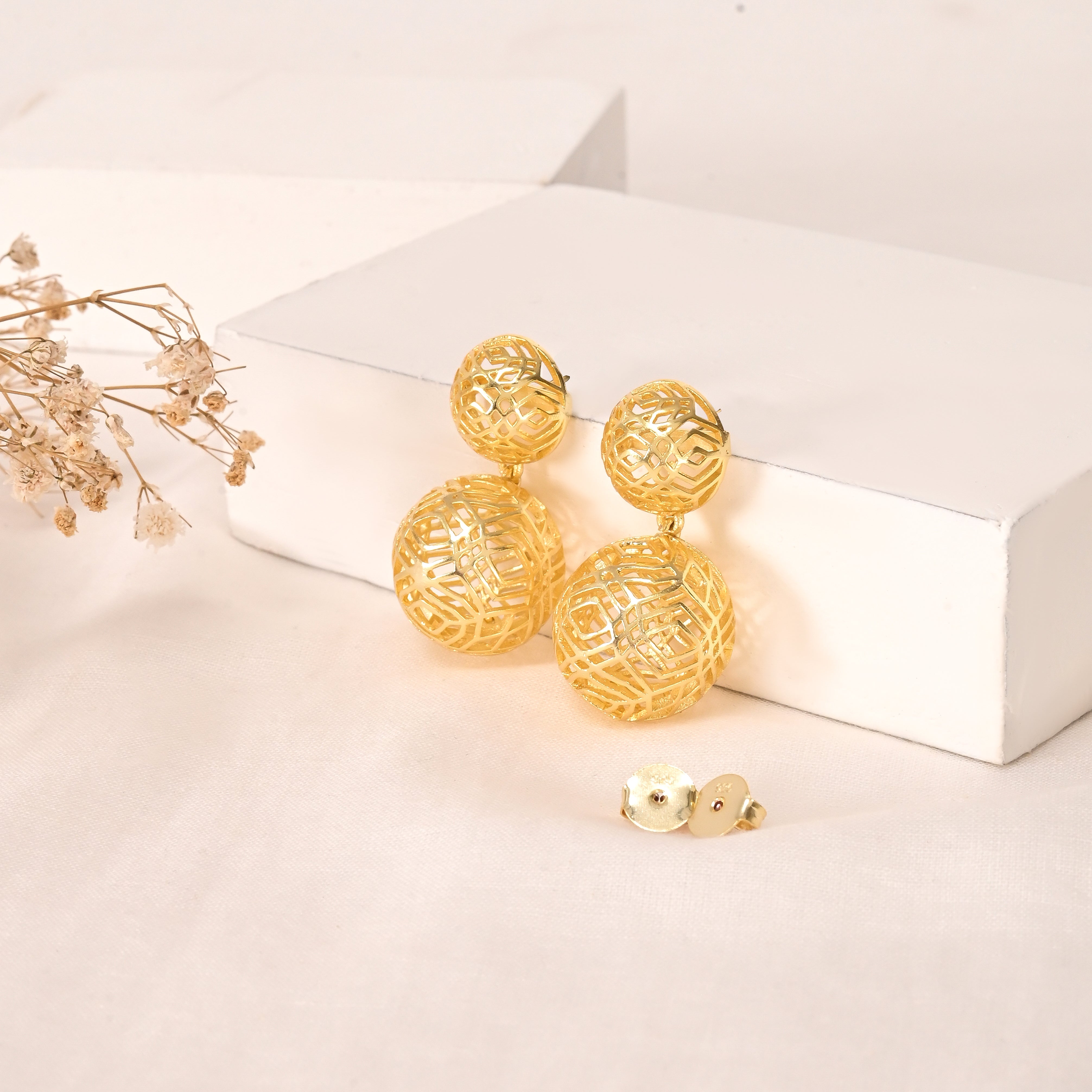 "MASKED BALL GOLD EARRING" capture the allure of mystery and elegance. Featuring a delicate small ball on top and a larger ball below, both adorned with an intricate lattice pattern, the design reflects the charm of a masked ball. Hollow from within and finished in 18kt gold plating, these earrings are lightweight yet striking, embodying a perfect balance of grace and grandeur.