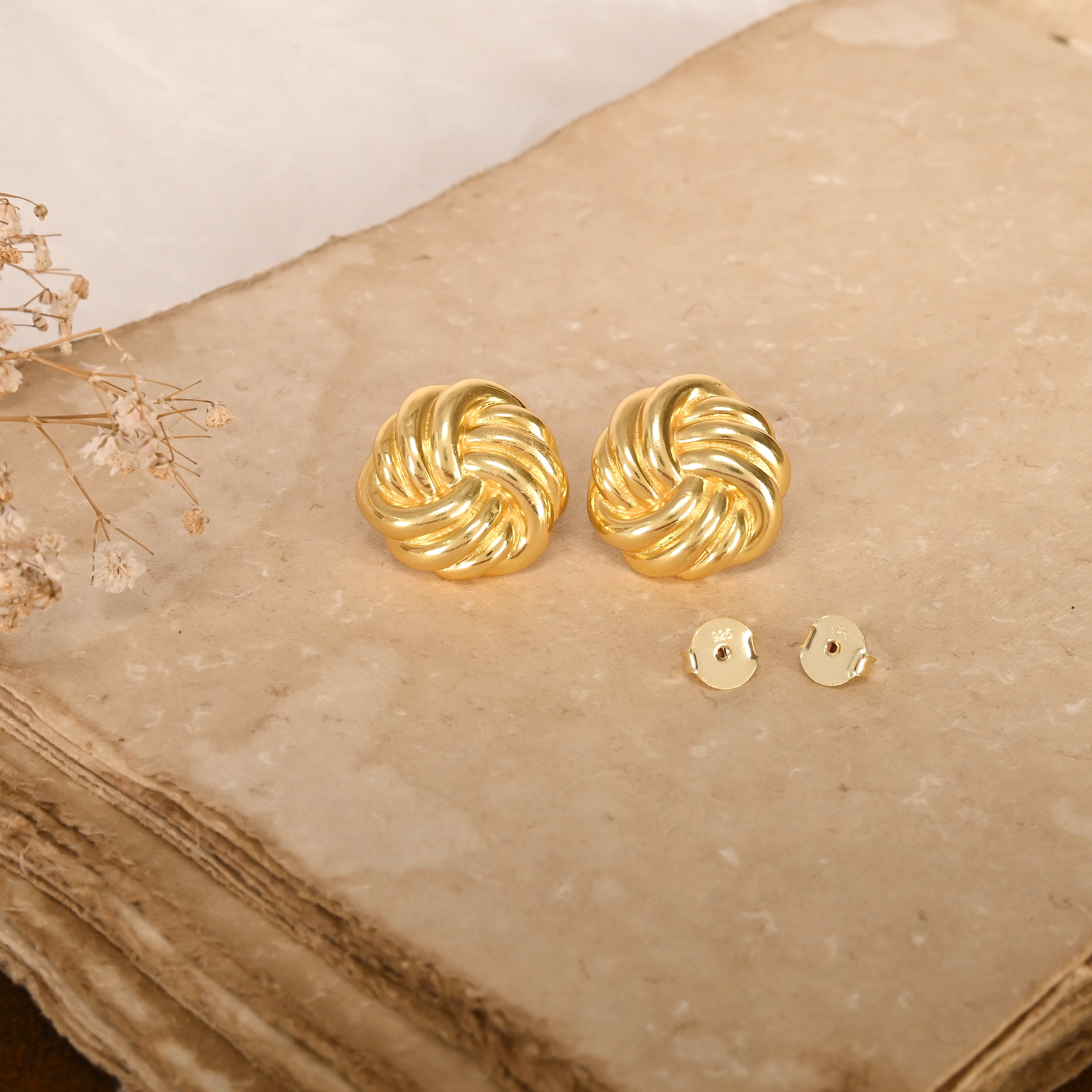 "KNOT FLUID GOLD STUD EARRING" a stunning design inspired by the timeless elegance of knots. This earring features intricate, knot like layers that symbolize strength, connection and unity. Its polished surface, described as fluid, enhances its sleek and modern appeal, creating a seamless blend of artistry and sophistication.Â