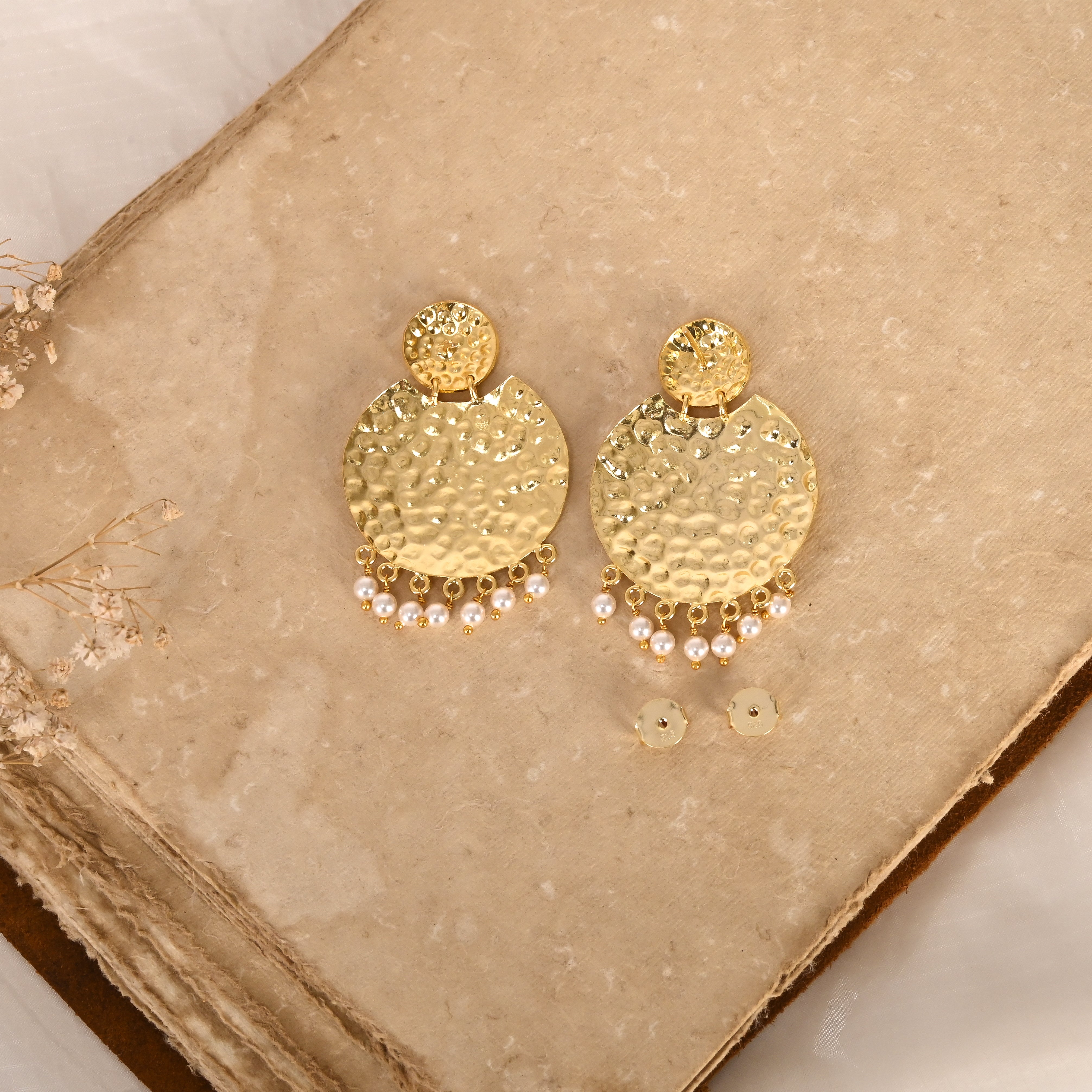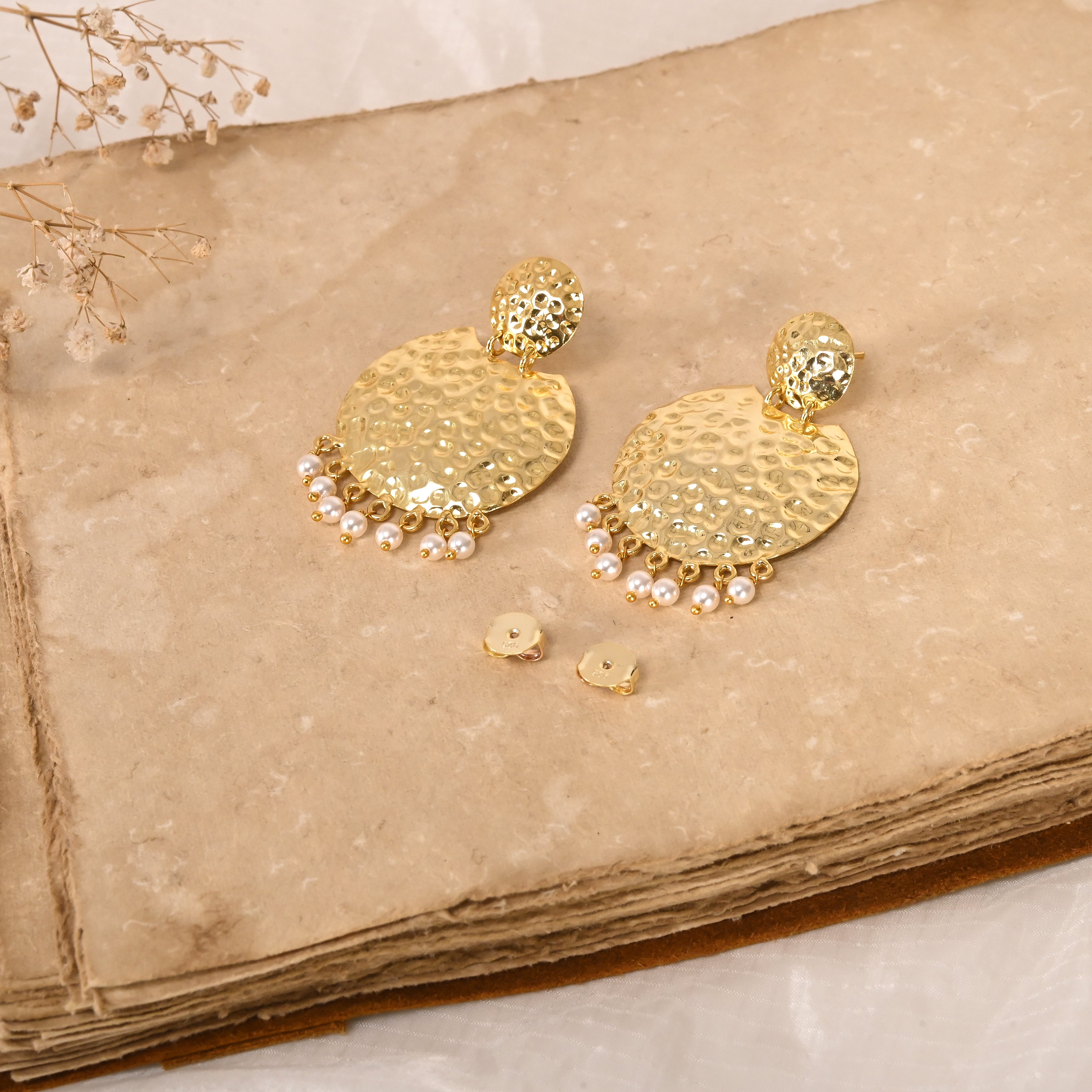 "SNOW CRUST GOLD EARRING" is Inspired by the rugged, dented, and textured patterns found on frozen ice and glaciers, this earring embodies the essence of untouched, icy terrains. Snowy symbolizes the purity and timeless charm of pearls, evoking the softness of freshly fallen snow. Crust reflects the bold, hammered textures reminiscent of glacier surfaces, adding a unique and edgy touch.